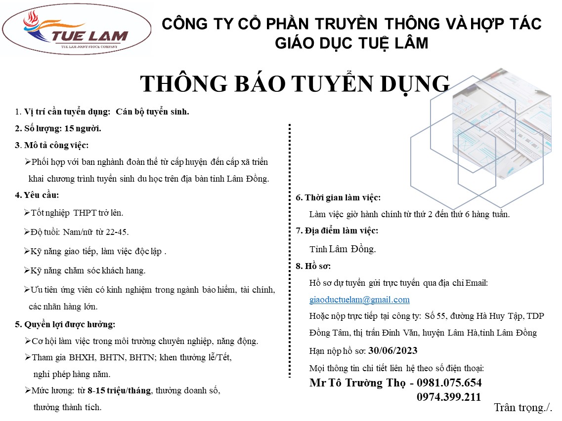 Công ty cổ phần truyền thông và hợp tác giáo dục Tuệ Lâm đang tuyển dụng vị trí: