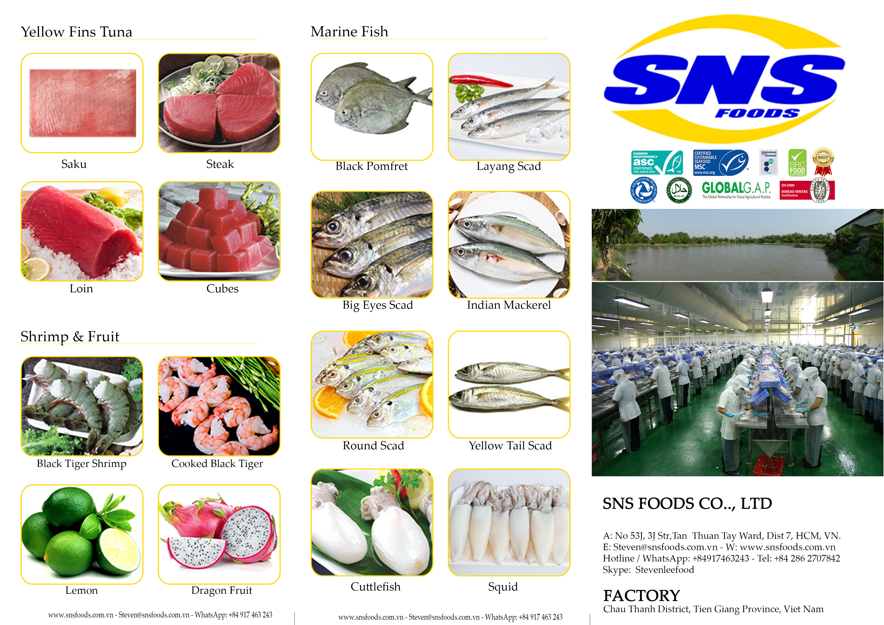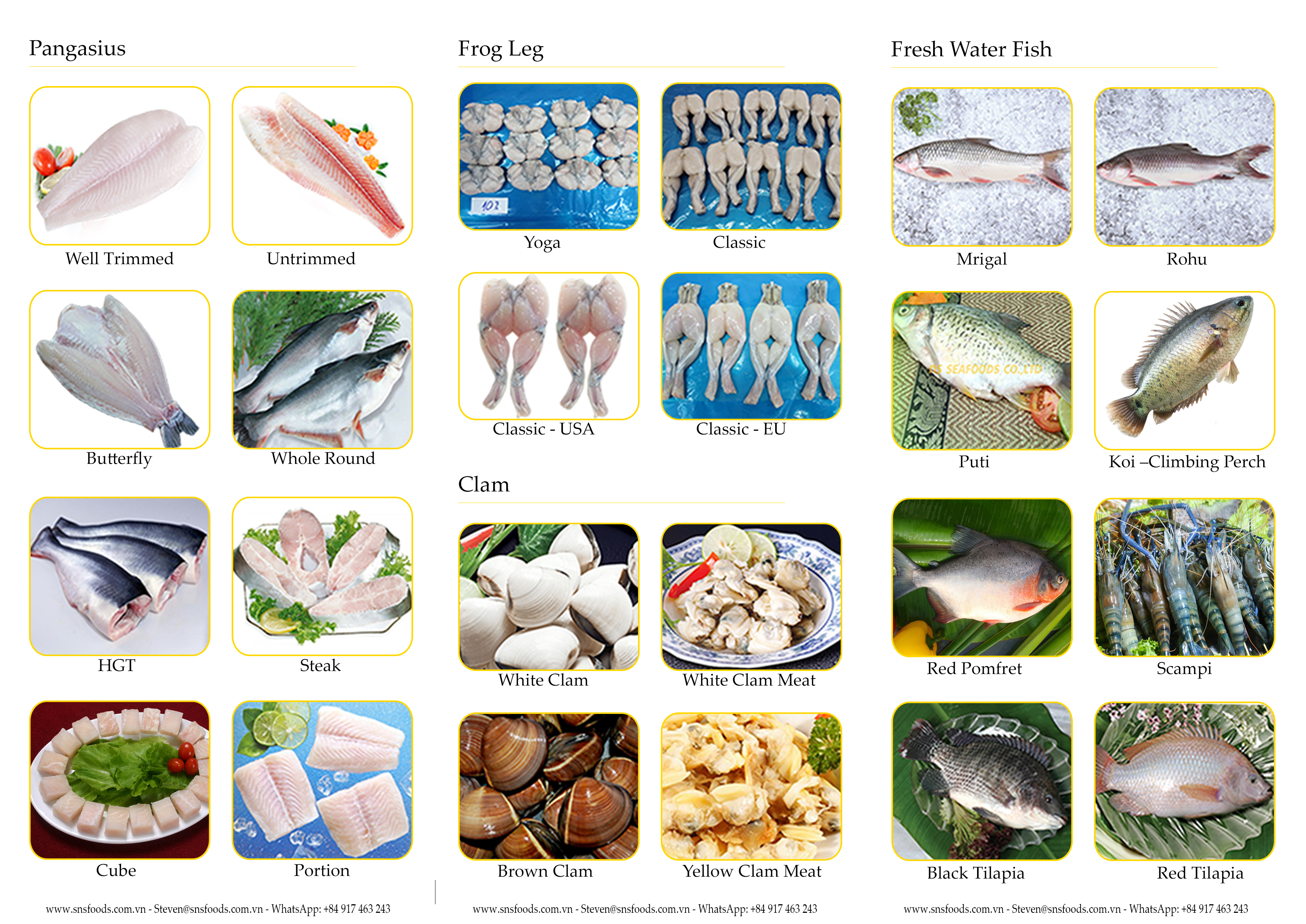• Seafood (Pangasius, Tuna, Clams, various marine fish, etc.)